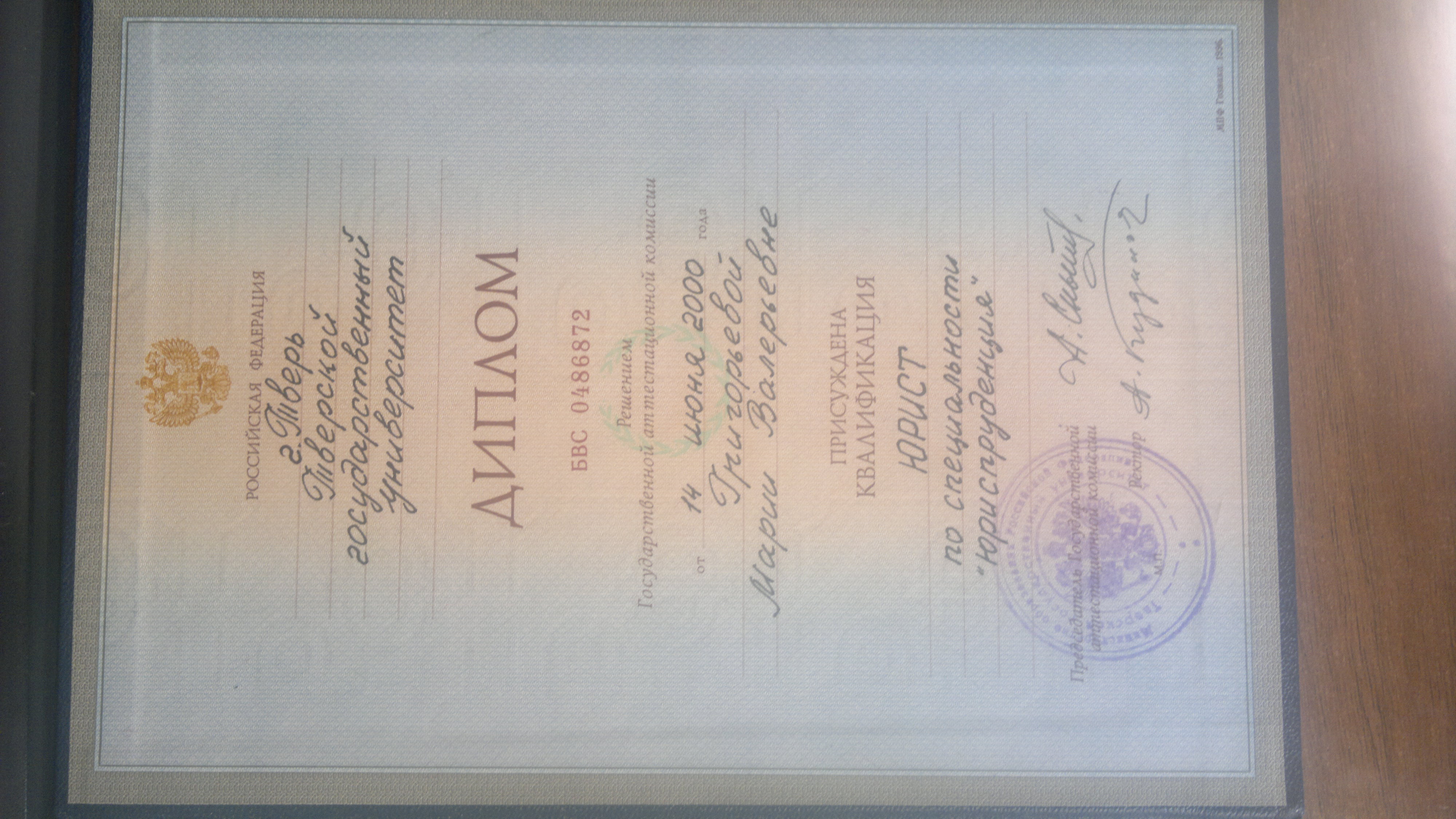 Тверской Государственный Университет, факультет - юридический (Тверь, Россия, 2000)