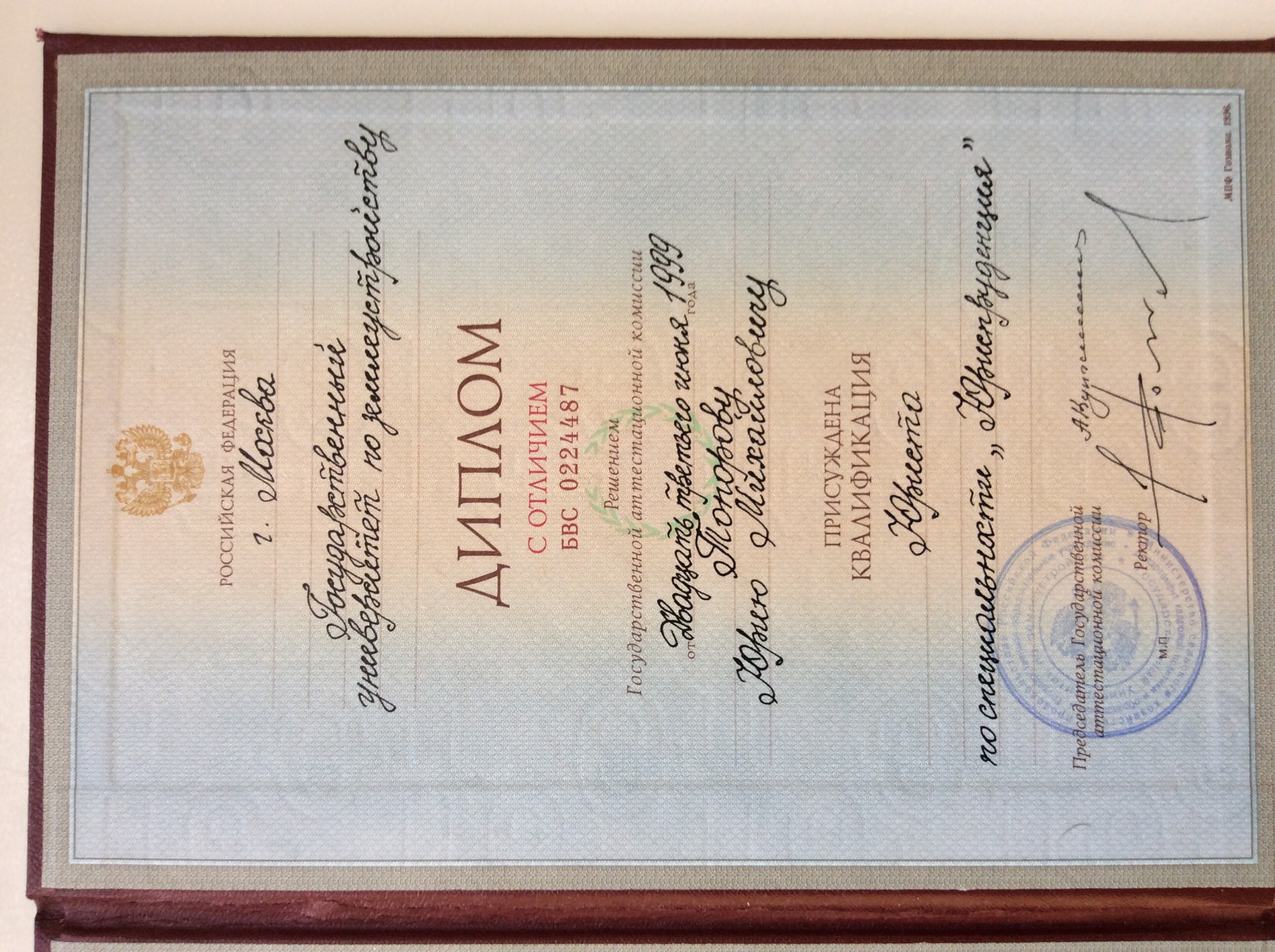 Государственный университет по землеустройству, факультет - Юридический (Москва, Россия, 1999)
