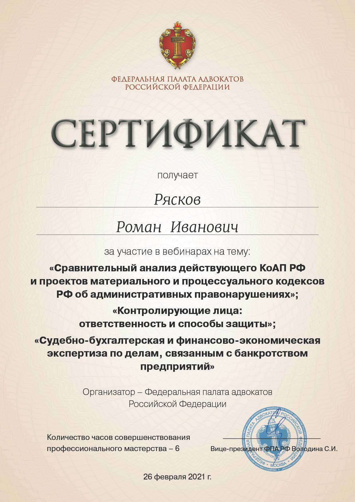 Ведущий адвокат Московской Городской Арбитражной и Налоговой Коллегии Адвокатов "Люди Дела" регистрационный номер 77/16464 в реестре адвокатов г.Москвы