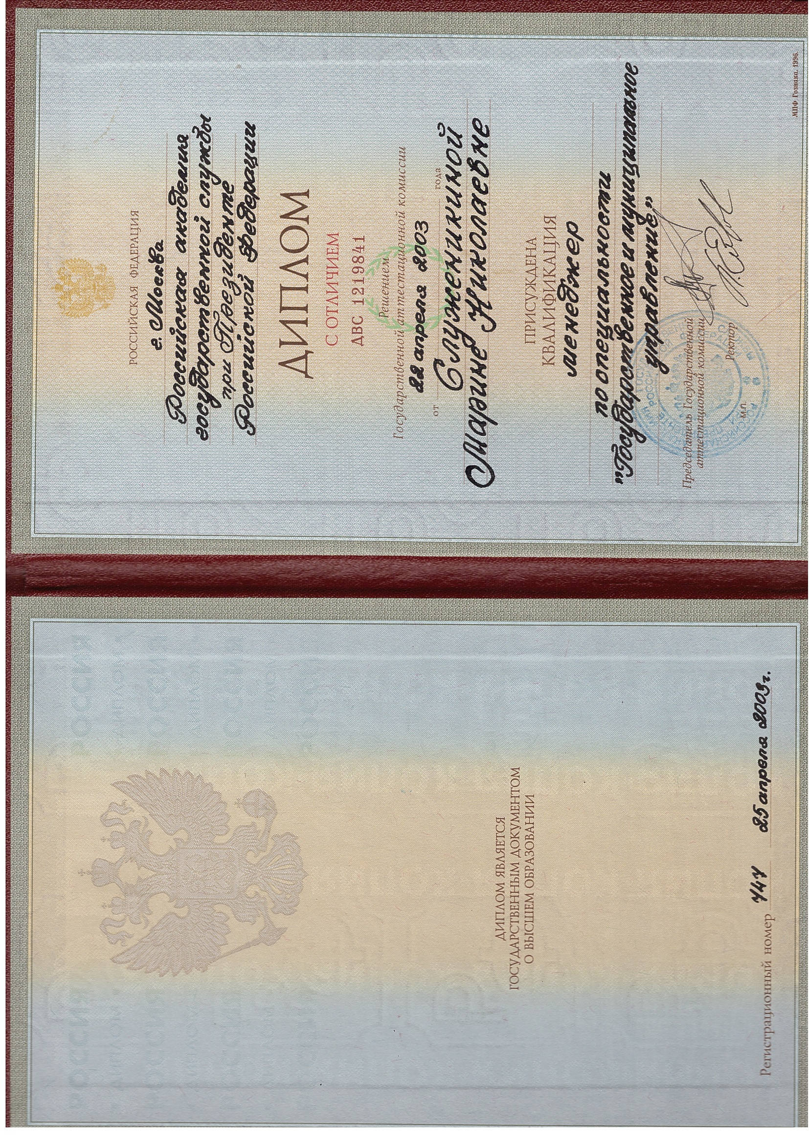 Российская академия государственной службы при Президенте РФ, факультет - государственное и муниципальное управление (Москва, Россия, 2003)